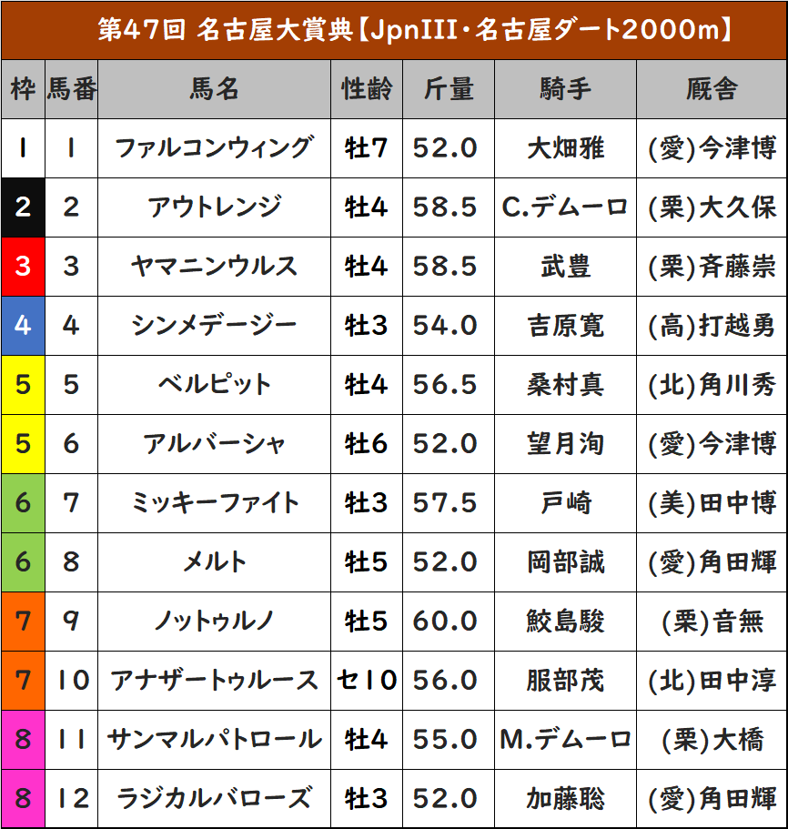 12月19日、名古屋競馬場でDG競走・名古屋大賞典(JpnIII、ダ2000m)が開催される。斤量はハンデで、1着賞金は3000万円。枠順は以下のとおり。