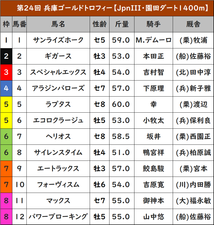 12月25日、園田競馬場でDG競走・兵庫ゴールドトロフィー(JpnIII、ダ1400m)が開催される。斤量はハンデで、1着賞金は3000万円。枠順は以下のとおり。