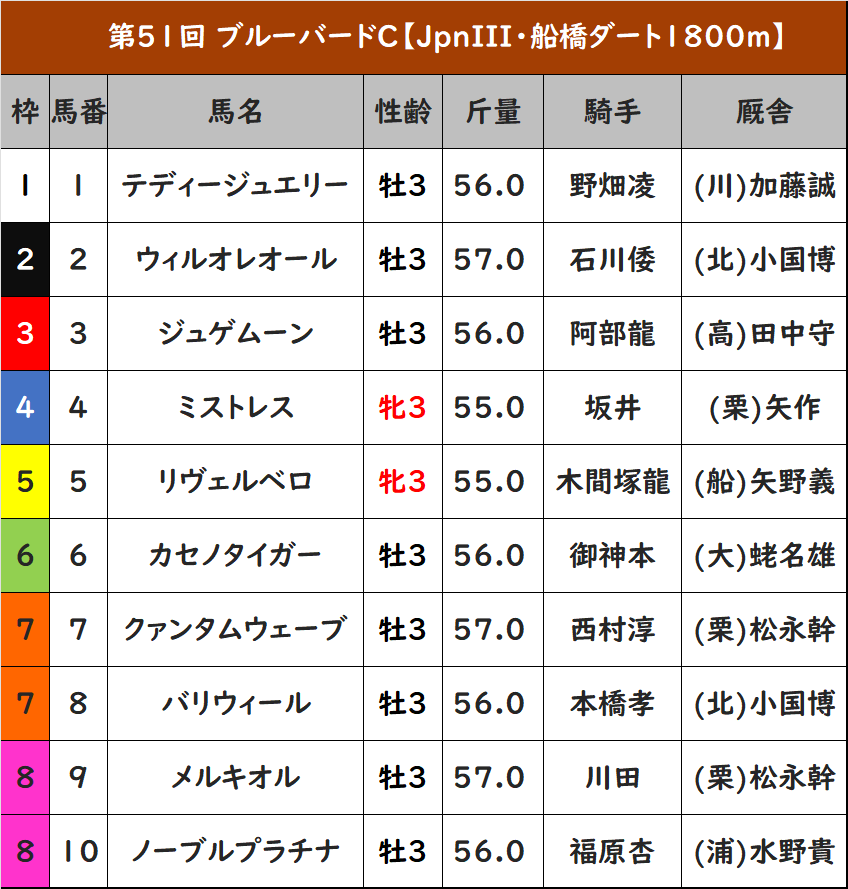 1月22日、船橋競馬場でDG競走・ブルーバードカップ(JpnIII、ダ1800m)が開催される。斤量は別定で、1着賞金は2400万円。1着の地方所属馬には羽田盃への優先出走権が付与される。枠順は以下のとおり。