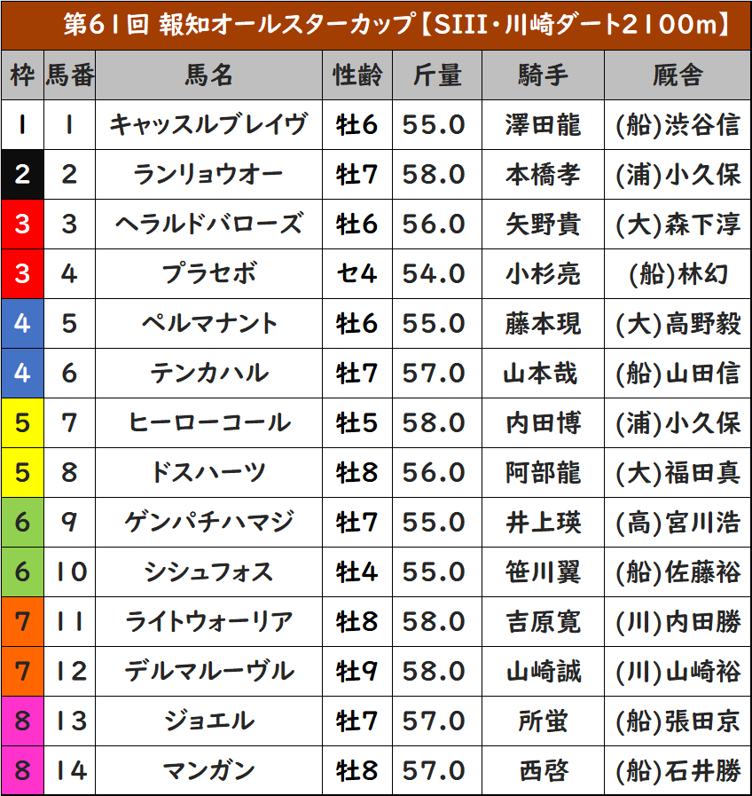 2月5日、川崎競馬場で重賞・報知オールスターカップ(SIII、ダ2100m)が開催される。斤量は別定で、1着賞金は1400万円。1着馬には川崎記念への優先出走権が付与される。発走時刻は16時10分。枠順は以下のとおり。