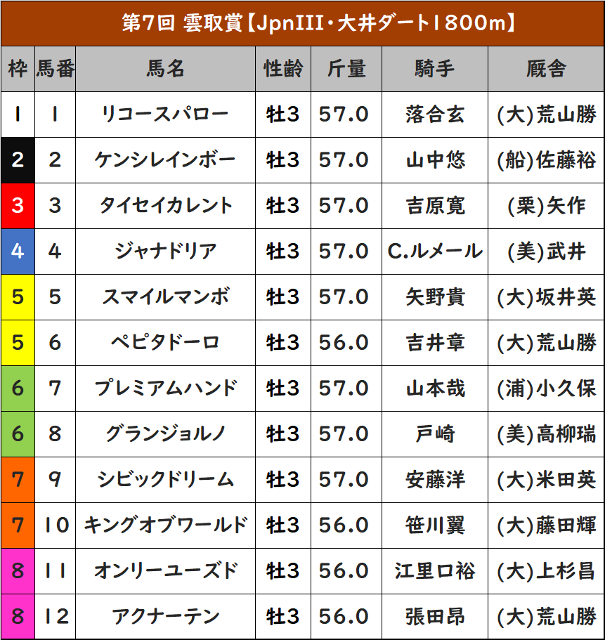 2月19日、大井競馬場でDG競走・雲取賞(JpnIII、ダ1800m)が開催される。斤量は別定で、1着賞金は2400万円。発走時刻は16時40分。JRA勢は5着以内の上位2頭に、地方勢は上位2頭に羽田盃への優先出走権が付与される。枠順は以下のとおり。